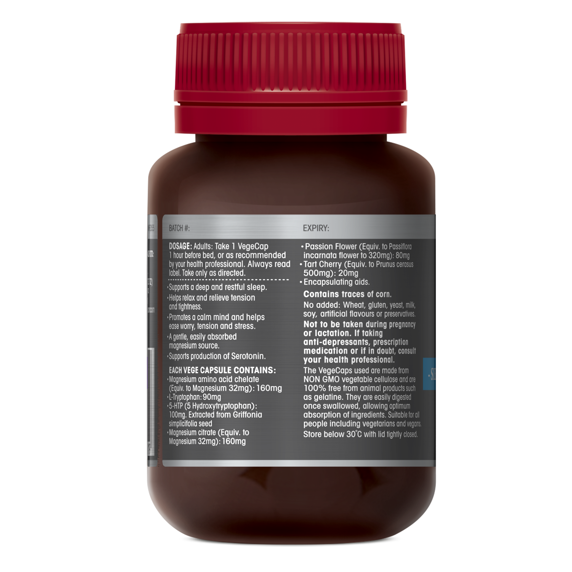 - 5-HTP (5 Hydroxytryptophan): 100mg. Extracted from Griffonia simplicifolia seed.